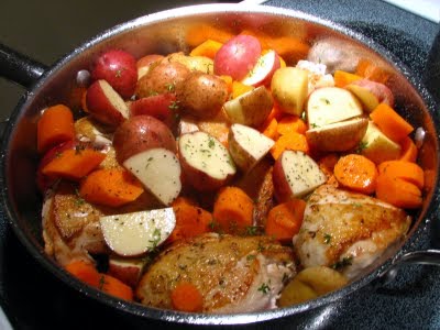 MY NOTES: This recipe was originally called CHICKEN IN A POT. I love it because you make the whole meal in one skillet and it tastes absolutely wonderful! The vegetables are supposed to be left whole so they won't overcook, even though the photo doesn't reflect that.