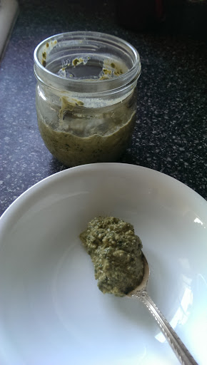Combine garlic, walnuts and cheese in the bowl of the food processor or blender. Puree into small bits. Add basil, salt, pepper sugar and balsamic vinegar. Puree again. With the machine running, add chicken broth and puree to make a smooth, thick paste. Spoon into a jar with a tight fitting lid. Store in the refrigerator.