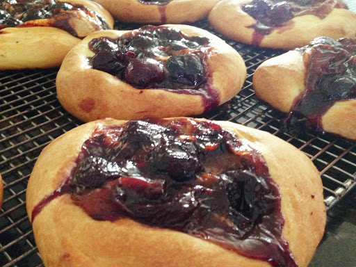 To prepare the cherries, combine the whole pitted cherries with the honey in a heavy bottomed saucepan. Cook over medium-high heat until they start to bubble, then turn the heat to low and cook, covered, for 10 minutes, until the cherries are soft and soupy. Allow to cool completely. (This can be done the night before baking when you have to make the brioche dough anyway.)