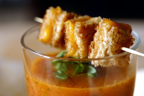 In a large stockpot on medium heat, saute the onions and garlic with 2 Tbsp of olive oil, butter (optional), and red pepper flakes for 10 minutes or until the onions begin to brown. Add the canned tomatoes, basil, thyme, and chicken stock. Then add the oven roasted tomatoes and include any of the liquid on the baking sheet. Bring to a boil and then simmer (uncovered) for 40 minutes. If you have a food mill, use that to pass the soup through. I used a Cuisinart to puree – mine was more on the chunky side – but you could also use a blender.