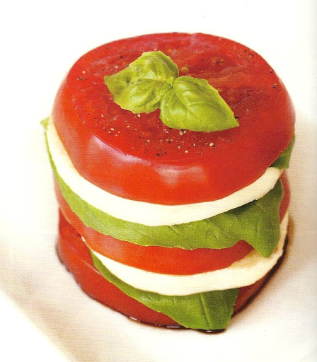 4. Start to compose “towers” of caprese: place a tomato slice onto a plate, top with vinaigrette, lay 2 basil leaves to that they remain sticking out, then stack a slice of mozzarella cheese and season with a pinch of cracked pepper and Sicilian sea salt. Repeat.
