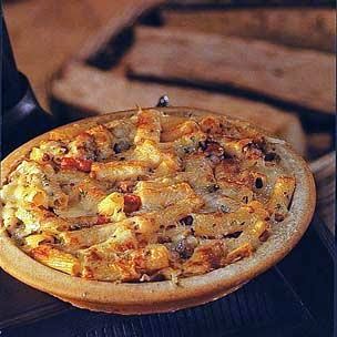 Oil the bottom of a shallow 3-quart baking dish. Spread half of the pasta mixture in the bottom of the dish. Sprinkle with half of the mozzarella. Top with the remaining pasta, the remaining mozzarella and the Parmesan. Bake until the sauce is bubbly and the top is crusty and golden brown, about 35 minutes. Remove from the oven, let stand for about 5 minutes and serve.