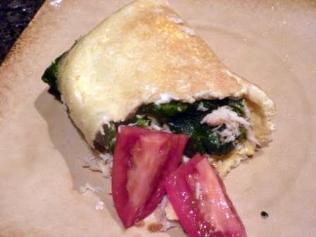 Mix the shredded chicken and all seasonings. Cook the eggs like an omelette on medium heat until just set. Layer one side of the omelette with the warm chicken. Crumble cheese over chicken (if using). Lay warm chilis flat on top of chicken and fold egg over. Slice into 3-4 pieces and serve.