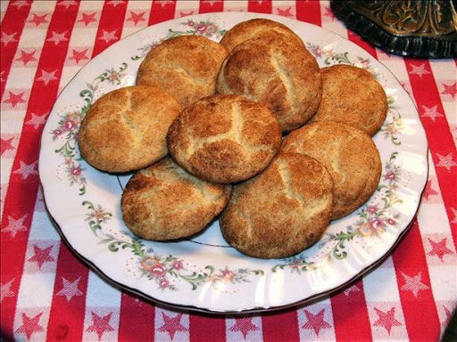 3. Roll into large walnut-sized balls making 17 balls. Roll WELL into cinnamon sugar mix. Place far apart on ungreased cookie sheets and bake at 400º for about 11 minutes. Remove to wire racks immediately to cool.