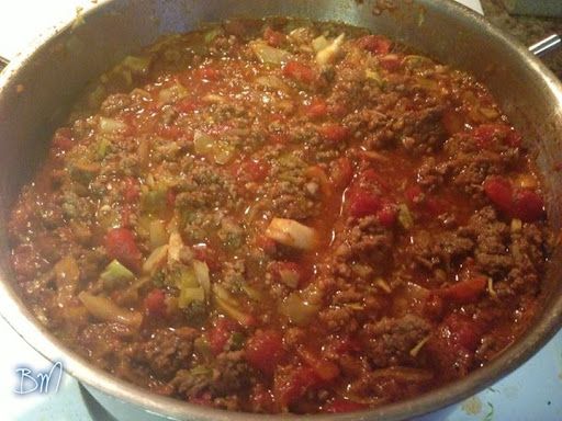 Add the chopped cabbage, tomatoes, tomato sauce, pepper, and salt. Bring to a boil. Cover and simmer for 20 to 30 minutes, or until cabbage is tender. i cooked whole wheat egg noodles and topped the unstuffed cabbage rolls on them and it was so good!!!