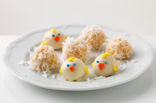 SHAPE into 32 (1-inch) balls. Roll 16 balls in coconut; place on waxed paper-covered rimmed baking sheet. Dip remaining balls in melted chocolate; add to baking sheet.