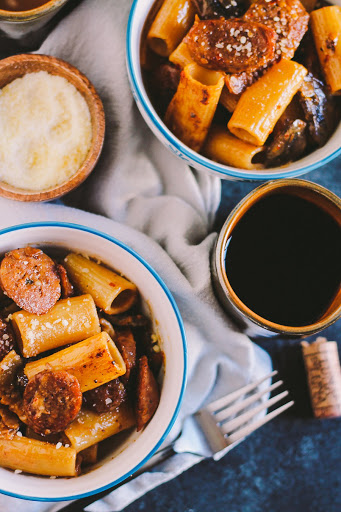 a comforting marsala pasta, with rigatoni noodles tossed into a creamy marsala pan sauce with spicy italian sausage & mushrooms.
