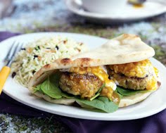 7. Warm chapati for 3 to 4 minutes in a preheated 400°F (200°C) oven. Line each round with spinach leaves, add 2 burgers and dollops of chutney and sour cream; fold over and place on warmed serving plate. Spoon rice alongside, garnish with coriander. Allow guests, Indian style, to remove whole spices from rice as they eat. Pass remaining chutney and sour cream.