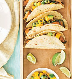 Your kids might eat fish when it's coated with spices and served in a tortilla. This no-oven meal is great for summer days. The tacos are topped with cool fruit salsa.