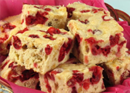 Heat the oven to 350 degrees. Spray an 8-inch square baking pan with cooking spray and lightly flour. Combine the butter and white vanilla chips in a 1-quart microwavable bowl; microwave on high for 1 minute. Stir until the chips are melted and set aside (the mixture may look curdled). In a large bowl, beat the eggs, sugar and almond extract until creamy. Add the butter mixture to the egg mixture. Beat until creamy and smooth. On low speed, beat in 2/3 cup flour, salt and sour cream until mixed. Toss the cranberries with 1 tablespoon of flour until coated; fold the cranberries into the batter. Spread the batter into the pan. Bake for 25 to 30 minutes or until set in the center and the top is golden brown. Cool the blondies completely (about 1 hour). Cut into bars, 5 rows by 3 rows.