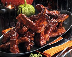 6. Cut slabs of ribs between bones into individual ribs and place in a large bowl. Add sauce and toss to coat evenly. Place on baking sheet meaty side up, leaning ribs against each other as necessary to hold upright, reserving any extra sauce. Bake for about 20 minutes, brushing halfway with reserved sauce, until ribs are glazed and sticky. Pile ribs on a warmed serving platter and serve immediately.