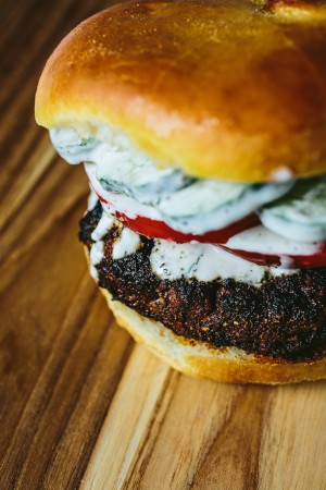 4. Place burger on the bottom of each bun, top each burger with a tomato slice, and finish with cucumber mixture and top bun.