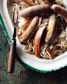 Transfer sauerkraut to a warm serving platter, and top with the sausages. Serve with pickles, cucumber, and mustards. (Sausages and sauerkraut can be kept warm, covered, in a 250-degree oven for up to an hour.)