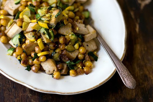 Heat 1 tablespoon of the ghee/olive oil In a large skillet over medium-high heat and stir in a big pinch of salt, the onion, and chickpeas. Saute until the chickpeas are deeply golden and crusty. Stir in the tofu and cook just until the tofu is heated through, just a minute or so. Stir in the kale and cook for one minute more. Remove everything from the skillet onto a large plate and set aside. In the same skillet heat the remaining tablespoon of ghee/olive oil, add the zucchini and saute until it starts to take on a bit of color, two or three minutes. Add the chickpea mixture back to the skillet, and remove from heat. Stir in the lemon juice and zest, taste, and season with a bit more salt if needed. Turn out onto a platter and serve family style.