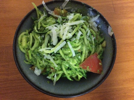 Overall, this was super good recipe and I would recommend it! It took me about 20 minutes from start to finish with my spiralizer so that is a quick easy dinner or side dish. I would recommend using a food processor and not a Nutribullet like I tried to do. I made a huge, bright green mess in the kitchen. Whoops.