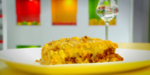 Precalentar el horno a 350 grados F. Colocar una bendeja de lata dentro. Enmantequillar el molde refractario a utilizar. Colocar la mitad de la preparacion en el molde, lueo agregar el relleno de carne. Finalmente colocar el resto de la mezcla encima. Espolvorear la taza de queso parmesano y pedacitos de mantequilla. Llevar al horno por 1 hora aprox.
