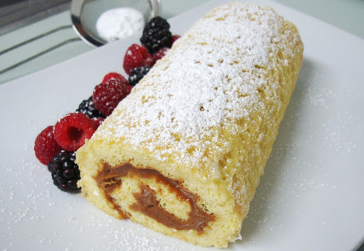 After a couple of hours, unroll the cake, cut the borders with a sharp knife, spread with dulce de leche and roll again without the cloth. Transfer to a plate, sprinkle with powdered sugar over the top.