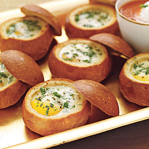 3. Bake until eggs are set and bread is toasted, 20 to 25 minutes. After eggs have cooked for 20 minutes, place bread tops on baking sheet and bake until golden brown. Let sit 5 minutes. Place tops on rolls and serve warm.