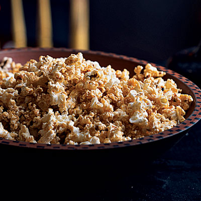 Coat a 15 x 10-inch jelly-roll pan or other large rimmed baking pan with cooking spray. Place popcorn in a large metal or glass bowl lightly coated with cooking spray.