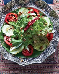 A specialty of Luang Prabang, chef Sebastien Rubis's refreshing salad is made with an array of delicious ingredientsgreens, shallot, hard-cooked egg, salted peanuts, tomatoes and cucumber.