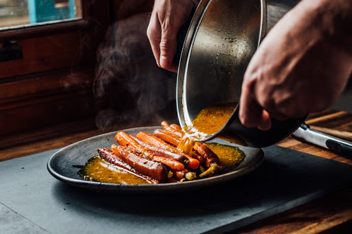 Trim and peel the carrots, leaving them whole if they are the recommended size. If they’re larger, cut them into chunks or in half lengthwise. Find a saucepan large enough to contain the carrots, and add the cumin, orange zest, garlic, oil, a pinch of salt, a large pinch of sugar, and orange juice. Turn the heat to medium and, stirring, bring to a boil.
