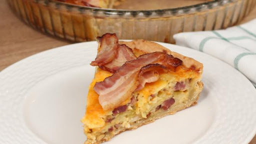 4) Assemble your quiche. Add half of the bacon and leeks mixture to the bottom of the pie crust, then top with 1 cup of hash browns and 1/2 cup cheddar cheese. Add the rest of the bacon and leeks and hash browns. Pour egg mixture into pie pan and top with remaining cheddar cheese. Cover with foil and bake in the oven for 30 minutes at 350 degrees Fahrenheit.