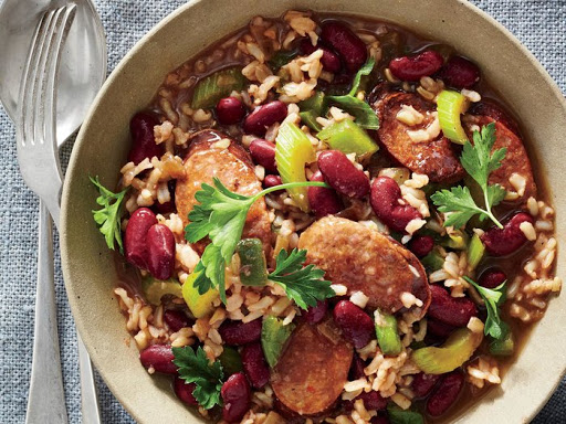 Stir in andouille and rice; cover and cook 1 hour or until rice is tender. Remove from heat; discard bay leaf. Stir in chopped parsley. Top with parsley leaves and serve with hot sauce, if desired.