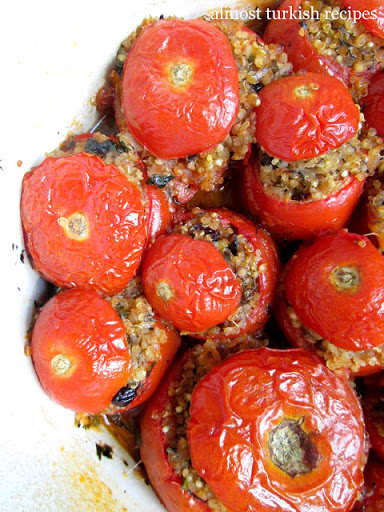 -Once it cools down start stuffing tomatoes with this mix. Do not over stuff them. Leave a little bit of room for quinoa to grow :) Place the tops that you cut earlier on top. That top will keep your dolmas moist. (If you are out of tomatoes and still have more stuffing try zucchinis or potatoes, or just eat the stuffing it's delicious.)