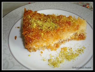 When kunefe comes out of the oven, ladle 2/3 of the hot syrup over it and save the rest to pass while eating.