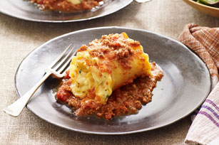 SPREAD half the meat sauce onto bottom of 13x9-inch baking dish sprayed with cooking spray.