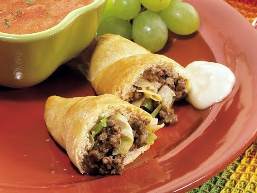 Heat oven to 375°F. In large skillet, cook ground beef and onion over medium-high heat until beef is thoroughly cooked, stirring frequently. Drain.2Add cabbage, salt and pepper; mix well. Reduce heat to medium; cover and cook 10 to 15 minutes or until cabbage is crisp-tender, stirring occasionally. Cool 5 minutes. Stir in cheese.3Separate dough into 16 triangles; press or roll each until slightly larger. Spoon about 1/4 cup beef mixture on shortest side of each triangle. Roll up, starting at shortest side of triangle, gently wrapping dough around beef mixture and rolling to opposite point. Pinch edges to seal. Place point side down on ungreased large cookie sheet.4Bake at 375°F. for 15 to 20 minutes or until golden brown. Meanwhile, in small bowl, combine mayonnaise and horseradish sauce; blend well.