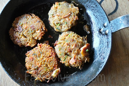 Cook 4 slices Canadian bacon in 2 Tbsp Butter; drain and minced. Shred 2 peeled Yukon Gold; squeeze dry.