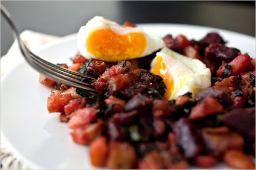 Heat the olive oil over medium heat in a large, heavy nonstick skillet. Add the potatoes, turn the heat to medium-high, and cook, stirring from time to time, until the potatoes are lightly browned, about five minutes. Stir in the garlic, beets, greens, thyme, salt and pepper. Cook, stirring often, for another five minutes, pressing the mixture down into the pan so the edges brown. Taste, and adjust salt and pepper. Stir in the vinegar if using. Serve, topped with a poached egg if desired.