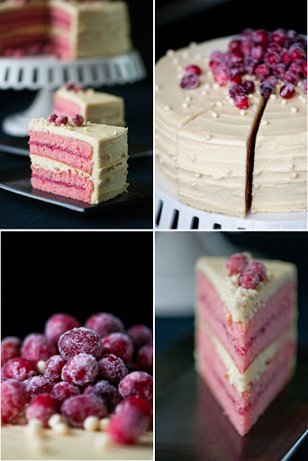 1. Cut each cake in half horizontally. Place one cake layer on the bottom of cake stand or serving platter, spread a generous layer of cranberry puree over cake layer and top with another layer. Spread about 1 cup of frosting on top and spread evenly. Repeat with the remaining 2 layers.
