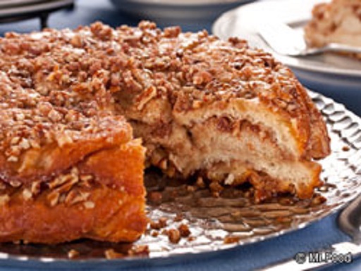 Separate each biscuit into 3 layers. Dip biscuit pieces one at a time in melted butter, making sure to coat each thoroughly. Layer 8 biscuit pieces in bottom of pie plate, completely covering pecan mixture. Repeat pecan mixture and biscuit layers 2 more times.