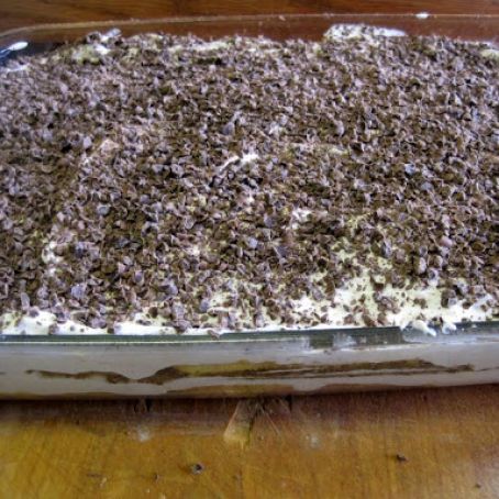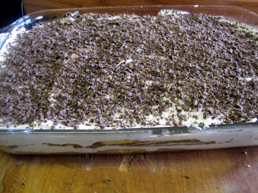Cut each twinkie in half, lengthwise. Dip half of the twinkie halves in the coffee/sugar syrup just to moisten them. Don't over saturate. Layer them, cream side up, in your dish. (Original recipe called for 12, I used a 9x12 pan and it took 15). Spread half of the cream mixture on top of the Twinkies, then grate some chocolate on top. I used a Hershey chips and put in my salad shooter. Repeat process. Refrigerate for at least 6 hours before serving.