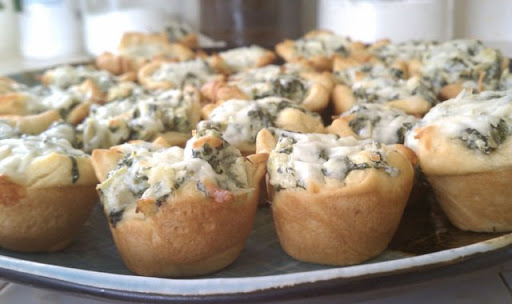 Press each of the dough squares into a mini muffin tin like so.Then, using a teaspoon, fill each cup with the spinach artichoke mixture.Sprinkle each one with a little shredded mozzarella.
