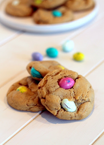 1.In the bowl of a stand mixer fitted with the paddle attachment, combine the butter, peanut butter, sugars, egg, vanilla, and beat on medium speed (I used 6 on my Kitchen Aid stand mixer) until well-creamed, light and fluffy, about 5 minutes (or use a hand mixer and beat for at least 7 minutes). Stop, scrape down the sides of the bowl, and add the flour, cornstarch, baking soda, salt, and mix until just combined, about 1 minute. Add the M&Ms and fold in by hand (Don't try and do this with the mixer - the M&M's will break!)