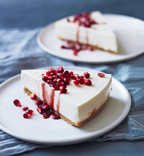 Cut cheesecake into slices, dipping knife into a large glass of warm water and wiping dry between slices, and place on plates. Drizzle pomegranate syrup over and scatter pomegranate seeds around.
