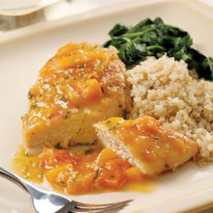 Off the heat, add wine and shallot to the pan. Return to medium heat and cook, scraping up any browned bits, until slightly reduced, about 3 minutes. Add apricots and cook until the fruit begins to break down, 2 to 3 minutes. Stir in preserves, thyme and the remaining 1/2 teaspoon salt. Return the chicken to the pan and cook until heated through, 1 to 2 minutes. Serve the chicken with the sauce.