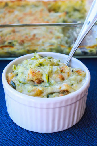 Bake zucchini au gratin for 20 minutes, until bubbly and the top is golden. Let cool for 10-15 minutes before serving.