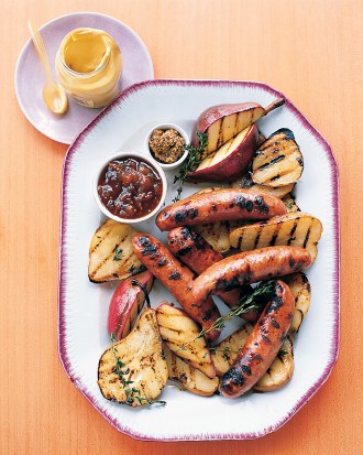 Grill sausages, turning frequently, until heated through, 10 to 12 minutes total. At the same time, grill pears until softened and lightly browned, 4 to 5 minutes per side. Top sausages and pears with thyme, and serve with chutney, mustards, and remaining dressing.
