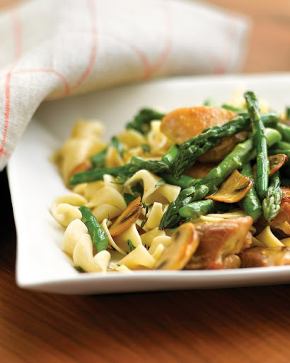To skillet, add mushrooms, asparagus, and 1 cup water; season with salt and pepper. Cook, tossing once and scraping up browned bits, until vegetables are crisp-tender, 4 to 6 minutes. Add chicken; cook, tossing, until warmed through, about 2 minutes. Serve on top of noodles or rice, if desired.