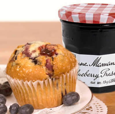 Use ice cream scoop or large spoon to divide batter equally among prepared muffin cups (batter should completely fill cups and mound slightly). Spoon teaspoon of Bonne Maman Wild Blueberry Preserves into center of each mound of batter. Using skewer, gently swirl preserves filling into batter using figure-eight motion. Sprinkle lemon sugar evenly over muffins.