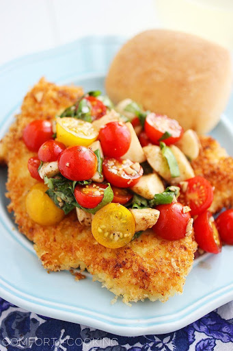 To me, it just doesn’t get more simple or scrumptious than this, and if you agree, I know you’ll absolutely love this recipe. Crispy, pan-fried Parmesan chicken cutlets topped with a sweet, juicy and fragrant tomato-mozzarella salad with fresh basil and an olive oil-balsamic drizzle. Well, go ahead and slap me, I think I’m dreaming!