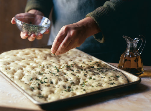 Position a rack in the lower third of the oven, and preheat to 450°F. Dimple the dough by pressing your fingertips all the way into it at 1-inch (2.5-cm.) intervals over the entire surface. Sprinkle it with the coarse salt, if desired.