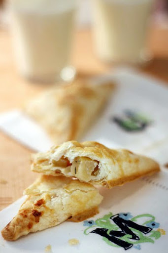 Fold each piece to form a triangle. Seal the edges with the tines of a fork, or pinch with two fingers. Brush the tops of the turnovers with more of the egg wash. Slice a few small slits in the top of the turnovers to allow steam to escape.