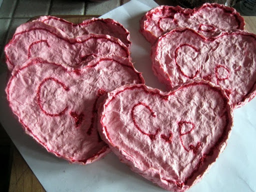 Preheat your oven to 200 degrees. Tear your construction paper into medium sized squares. Add to the blender with the HOT water. Let this sit for about 5 minutes. Pulse the paper and water in the blender for about 30 seconds or until your mixture looks more like pulp. Place a kitchen towel on a plate and lay a paper towel over top (absorb the water). Place the heart shaped cookie cutter on top of the paper towel and begin spooning the mixture into the cookie cutter. Make sure to fill it up all the way to the top. Once you have it smooth, add glitter and press down gently. Carefully remove the heart and place it on a baking sheet. Repeat this process until you have the amount of hearts you would like. Place the hearts into the oven and bake for about 2 to 2 1/2 hours. When they are finished you will fill no more moisture. Sign the back with your favorite Valentine's Day message and give them out to your loved ones!