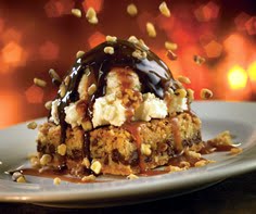 Enjoy Chili's Chocolate Chip Paradise Pie warm with a big scoop of ice cream and top it off with a drizzle of fudge, caramel and walnuts! Yum!