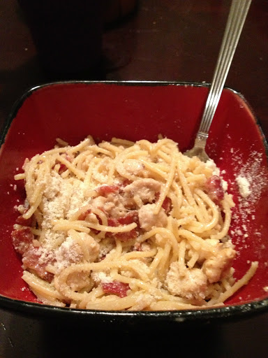 3.Cook onion and garlic in bacon fat over medium heat about 3 minutes, stirring frequently, until onion is tender. Stir in spaghetti, chicken, cheese and whipping cream. Cook, stirring occasionally, until heated through. Toss with bacon.